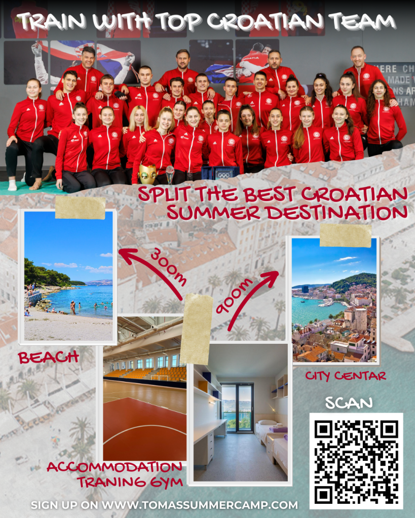 We invite you to the TOMAS SUMMER CAMP, which will be held in Split from August 20th to August 27th, 2025. Split is a city where history meets modern rhythm, and with every step through its streets you discover traces of the Roman era, such as the impressive Diocletian’s Palace. With crystal clear sea, golden beaches and numerous islands nearby, Split offers an unforgettable summer experience. This camp represents a unique opportunity for all taekwondo enthusiasts, whether you are a cadet, junior or senior, wanting to improve your skills under the guidance of top coaches and athletes.